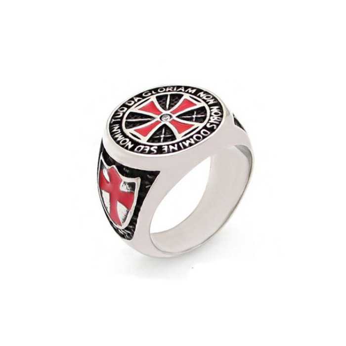 Hier ist eine schöne stahltemplarring edelstahl im zentrum eines malzkreuz rot, zwei schwerter überquerten und schließlich eine strass in der mitte eingelassen, um dieses modell zu verschönern, das den größten juweliern würdig ist. Im Zentrum, dies rotes kreuz auf einem hintergrund geformt wappen auf jeder seite, erweitert die ästhetische linie des rings und bringt ihm ein zusätzliches volumen.