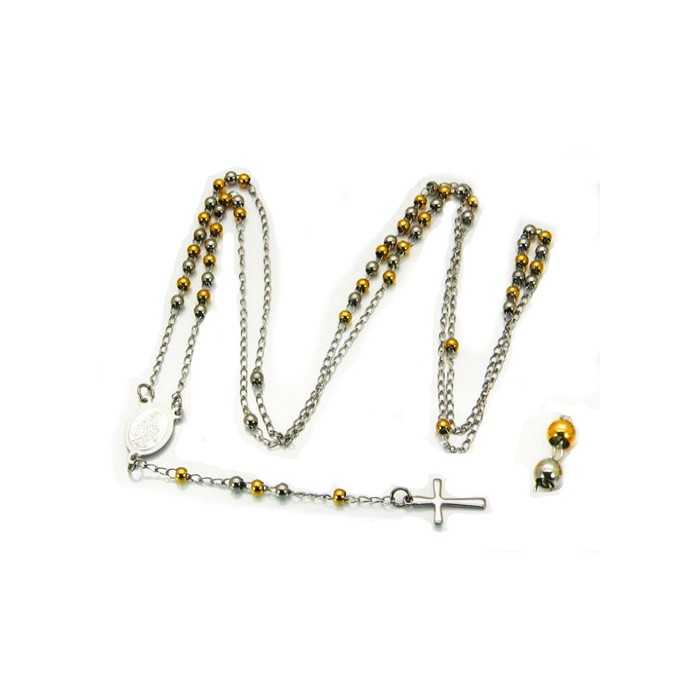Diese römisch-katholische Perle aus Edelstahl ist mit einer feinen Kette mit Gold und Silber Perlen, abwechselnd 3mm breit ausgestattet. Das Kreuz und die Medaille ''Notre-Dame de Guadalupe'' ergänzen den Stil. In der Tat, auf der Rückseite der Wundermedaille, ist es die selige Jungfrau, umgeben von der Inschrift "nuestra señora de guadalupe" auf Spanisch, die bedeutet "Unsere Frau von Guadalupe". Im Rücken überstieg Marys "M" ein Kreuz, das ihre Krone und Macht über die Schöpfung symbolisiert. Das „M“ ist der Anfang Marias, das Kreuz ist das von Christus. Die beiden miteinander verflochtenen Zeichen zeigen die unlösliche Beziehung zwischen Christus und seiner heiligen Mutter. Unten. die Herzen Jesu und Marias erscheinen, von denen zwei Flammen auferstehen, die die Menschen lieben. Alle umher sind zwölf Sterne gezeichnet. Sie entsprechen den zwölf Aposteln und repräsentieren die Kirche.
