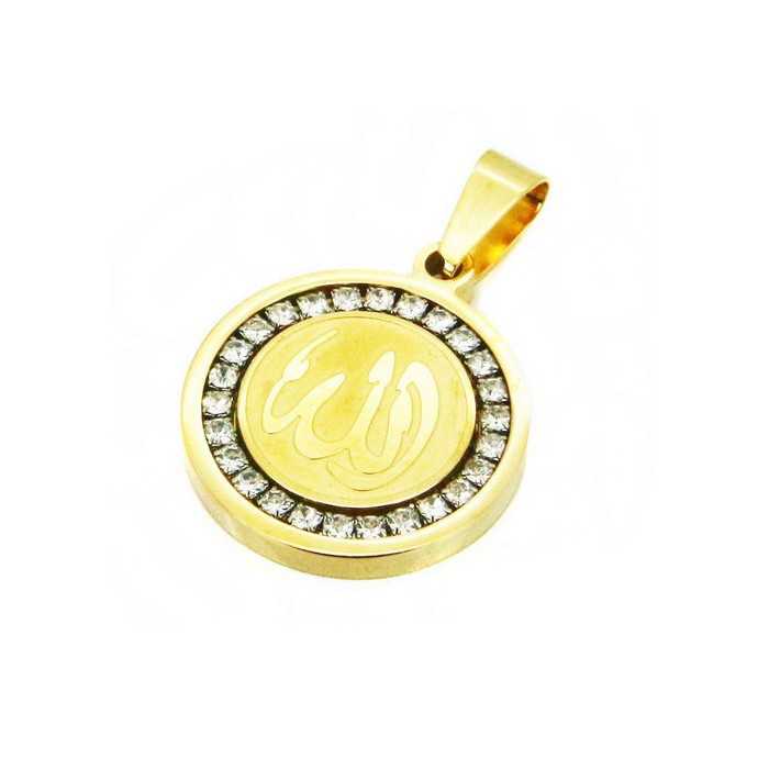 Rundförmige Anhänger wie ein Stahlmedaillon mit Gold überzogen durch Ionisation graviert in der Mitte des Wortes: "Allah" in arabischer Schrift und mit Diamant-Effekt-Kristallen rund um.