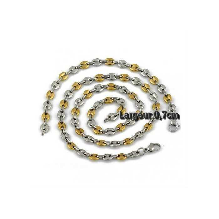 ManBijoux presents this pretty adornment necklace and bracelet in bicolored coffee beans mesh stainless steel with a sober, sleek and delicate design. It imposes itself as a sure value with its resolutely timeless touch. Its width is 7mm and the necklace has a length of 60cm. This chain and bracelet is equipped with a clasp carabiner secure and discreet at the same time. The chain and bracelet in silver and gold coloured coffee beans is composed of oval links slightly curved, resembling coffee beans, arranged regularly and connected by small rings. Each link has a central groove that accentuates the resemblance to a real coffee grain. This chain is appreciated for its sleek and masculine design, although it can also be suitable for the feminine glove. The jewelry in coffee beans remain a safe and highly appreciated value, perfect as birthday gift, of Christmas, of Valentine's Day or simply to surprise and please.