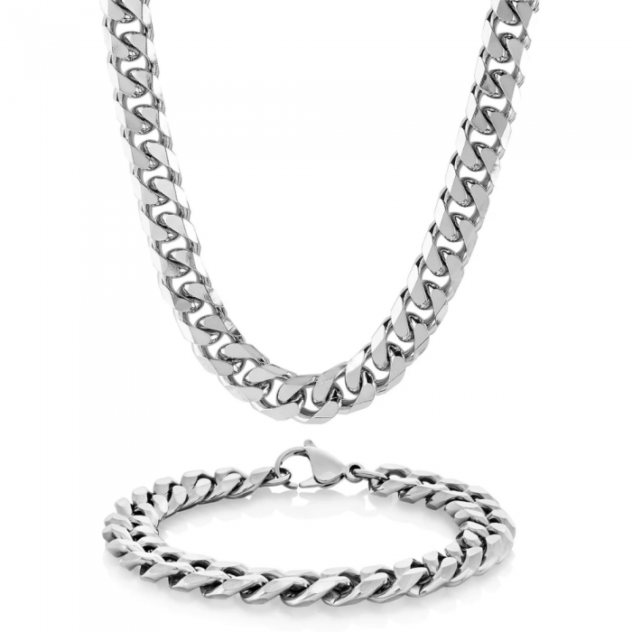 A parure (chain+bracelet) with a width of 8mm to thick Cuban mesh in high-end polished stainless steel. Ideal for those wishing a bling bling look. The secure clasp in the form of sheep is very easy to position.