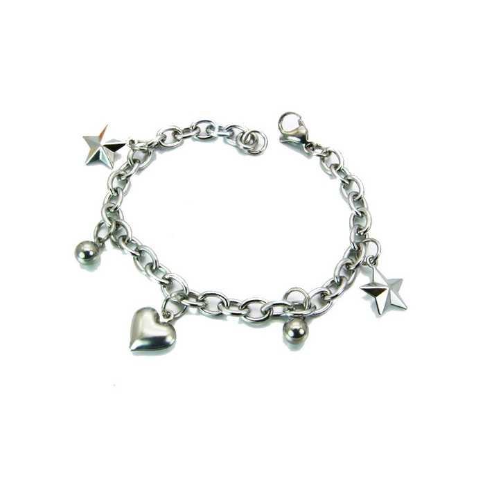 This lovely women's bracelet is made of stainless steel. This glamorous-style bracelet is made of star-shaped, ball-shaped and heart-shaped birch.