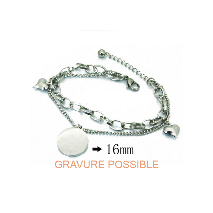 ManBijoux presents this lovely women's bracelet in steel stainless steel with a double chain of two heart-shaped charms and medallion to customize by engraving according to your desires on both sides to make this bracelet even more unique.