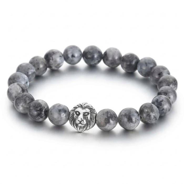 Men's Bracelet Natural Grey Agate Beads and Lion Head Steel