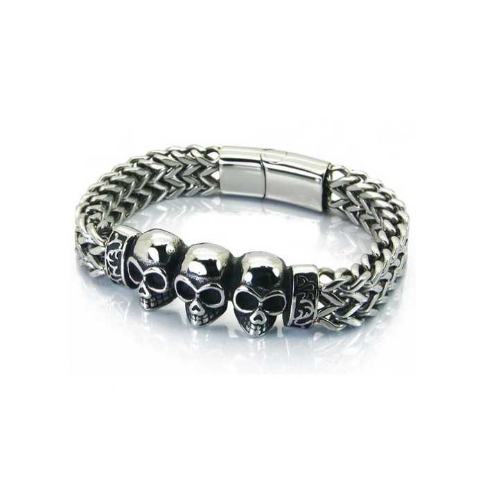 This stainless steel bracelet is a real gem of ingenuity and craftsmanship. With their carnival smiles, these three heads of death are both intriguing and threatening, so you're confused.