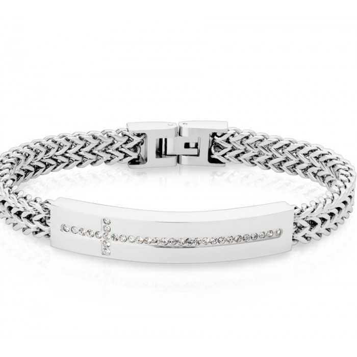 Men's V mesh curb chain bracelet in steel with crystal cross plate 22cm