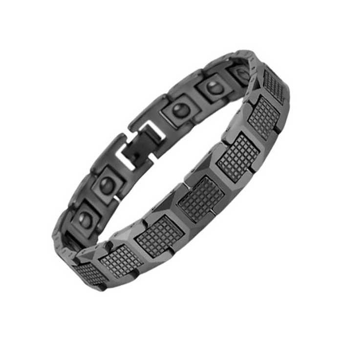 We present this bracelet to you both this beautiful and therapeutic designed in solid tungsten carbide. Its matte black color will easily adapt to good number of dress looks. It consists of a carefully embossed segment assembly in the form of “H” intersected with rectangular links with a distinctive relief effect. This gourmet with a very marked male stamp that adds a seductive virility to the hand gesture, has a secure and discreet clasp at once.