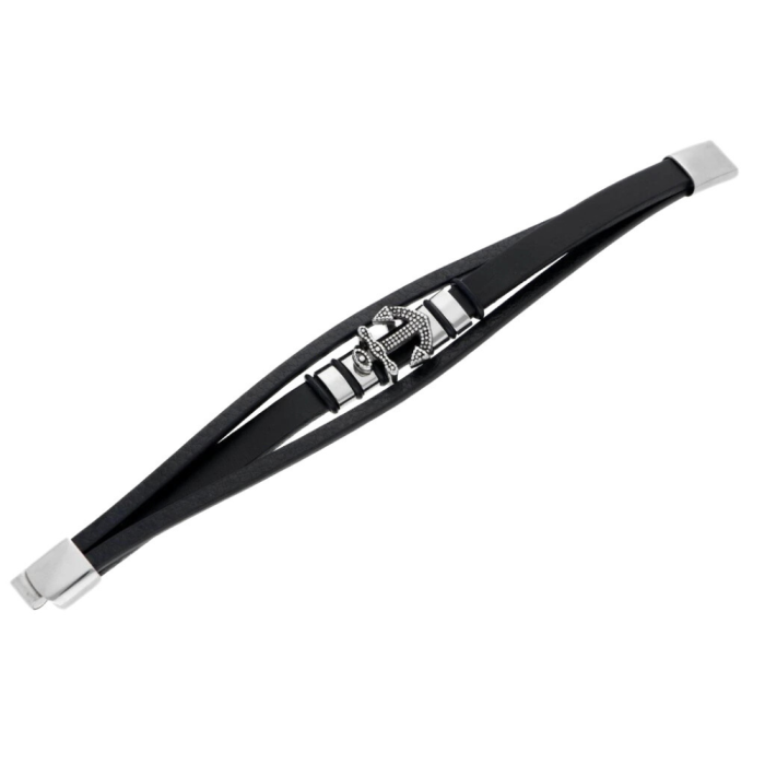Men's double leather cord bracelet with black steel clasp, navy anchor 22cm