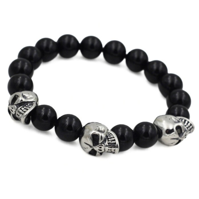 Black Onyx Man Biker Bracelet with Stainless Steel Death Heads