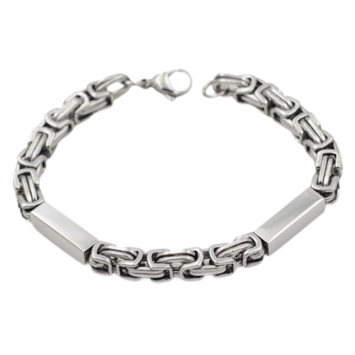 Stainless steel man bracelet with Byzantine mesh and two customizable rectangular plates. An elegant male jewel, robust and ideal for unique engraving.