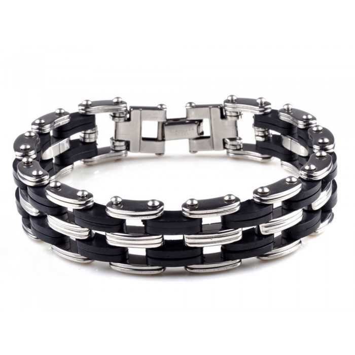 Magnificent handcuff for men in stainless steel and black rubber. This elegant gourmet is equipped with a secure and discreet clasp at a time. A male gourmet who adds a seductive virility to the hand gesture.
