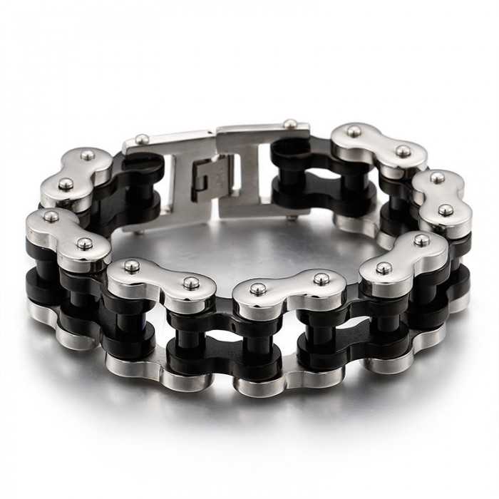 Heavy, wide, large are the words characterizing this stainless steel bracelet and black plated whose structure resembles that of a motorcycle chain.