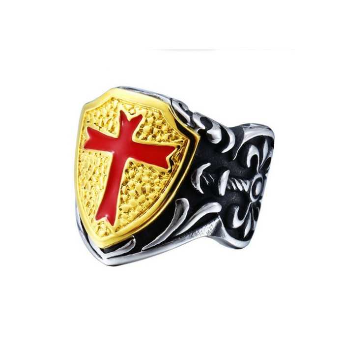 Men's signet ring steel golden coat of arms medieval red cross shield Templar
