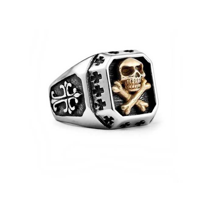Ring steel knight stainless steel adorned with skull and bone gold plated. This royalist knight is also engraved with two lys flower cross and 14 small roman crosses.