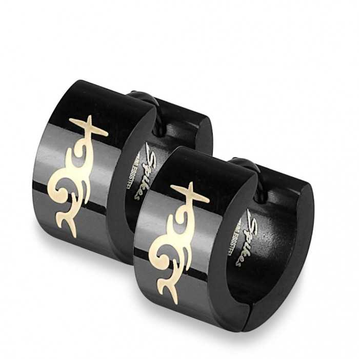 These earrings for men in beautiful black steel varnish effect are decorated with a splendid tribal. Each loop consists of two portions of articulated circles which close by simple pressure on the right stem for pierced ears.