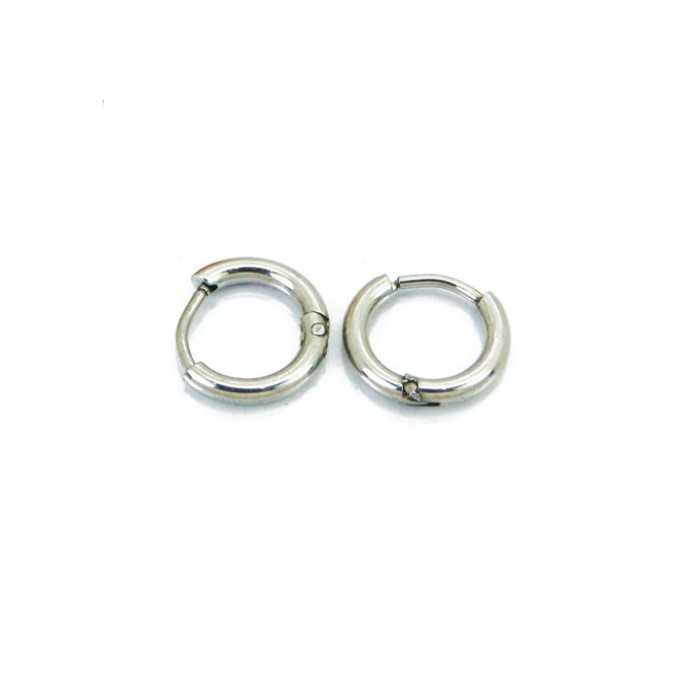 Fine pair of high quality stainless steel earrings with an inner diameter of 8mm. A stem, slightly arched, connects the two thick rings, divided into two. They close by simple finger pressure on the stem which makes it easy to pose and ensures reliability to the jewel. A very class jewel offered at small price.