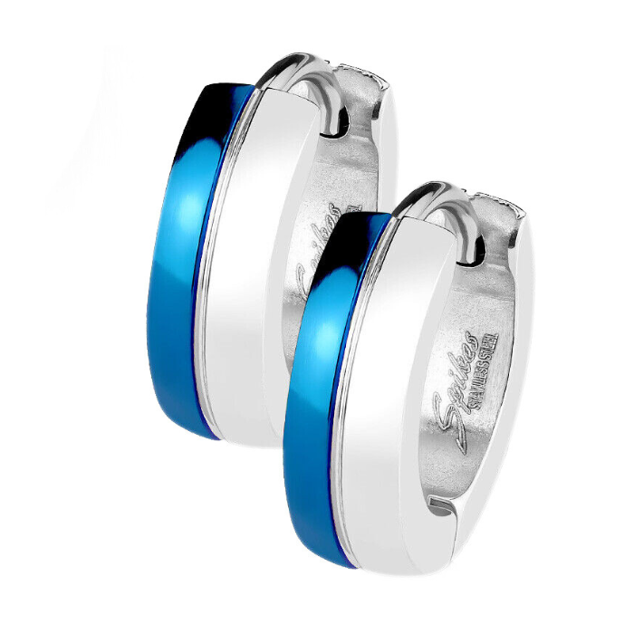 On the apparent surface, the outer edges of blue plated colour were glossed. They frame a brushed band with silvery reflections. These short creoles close with a simple finger pressure by a secure curved rod.
