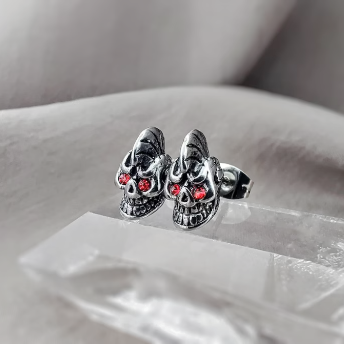 We offer you these earrings designed in stainless steel that perfectly represent a head of death with sharp teeth and with a whispering look of their red blood zircons. The stylized ridge that adorns the top of this demonic skull brings the final touch to the unique composition of this disturbing jewel. To wear alone or in pairs according to your desire to avenge you from your enemies. At the minimum price is added the quality and safety of not losing this jewel with an adjustable pushchair.