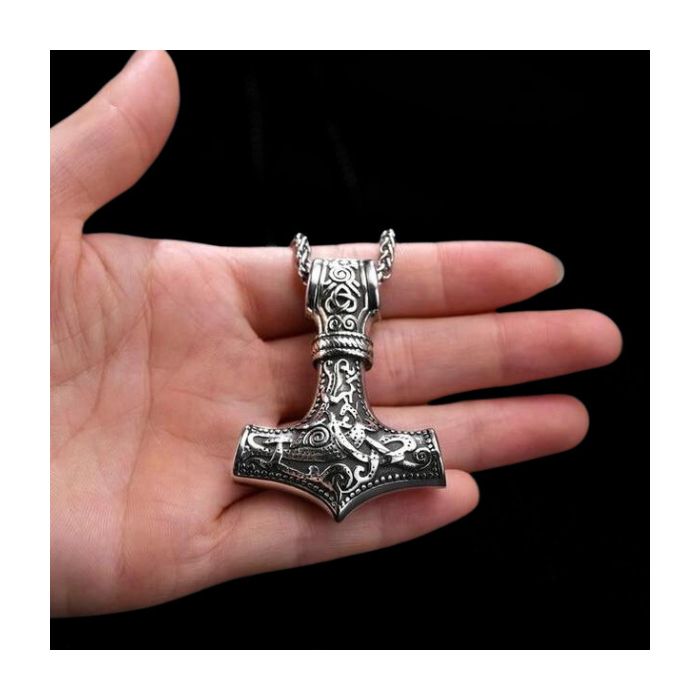 Embrace the power and strength of the viking warriors this viking pendant necklace stainless steel representing wonderfully the hammer of Thor and/or Mjolnir, which is usually worn as a symbol of protection and power. This is a high-quality replica of Mjolnir in the Mammen style. Celtic knot chest hammer symbolizes courage and is considered a talisman by the Vikings. This pendant was luxuriously decorated on both sides with Mammen-style ornaments. These truly unique plant motifs were carved on a true axe Mammen.