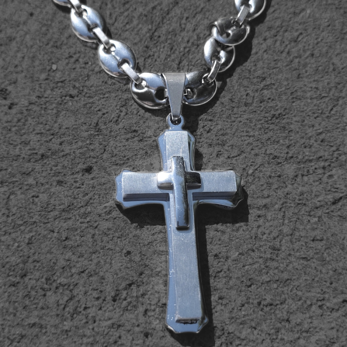 Men's pendant with three superimposed crosses and steel coffee bean chain