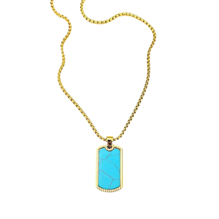 Let yourself be seduced by the captivating and galactic look of the turquoise stone with this men's necklace pendant. This necklace modern pendant for men, made of gold stainless steel with fine gold, is inspired by a military plate with rounded edges. Its plaque is beautifully decorated with a turquoise marbled stone front face and back of pendant is customizable. It is presented and sold with its stylish chain.