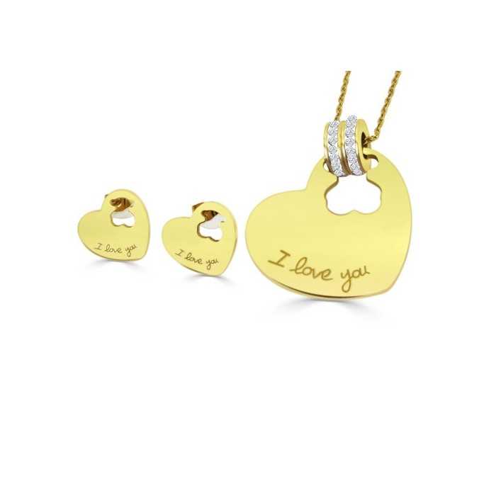 Here's a beautiful look that will make you spit at the first glance, composed of a fine chain, a pendant and earrings that both have the shape of a heart. On the left side of the heart, it is engraved the phrase "I love you" and the right side is finely pinned thus forming a bear.