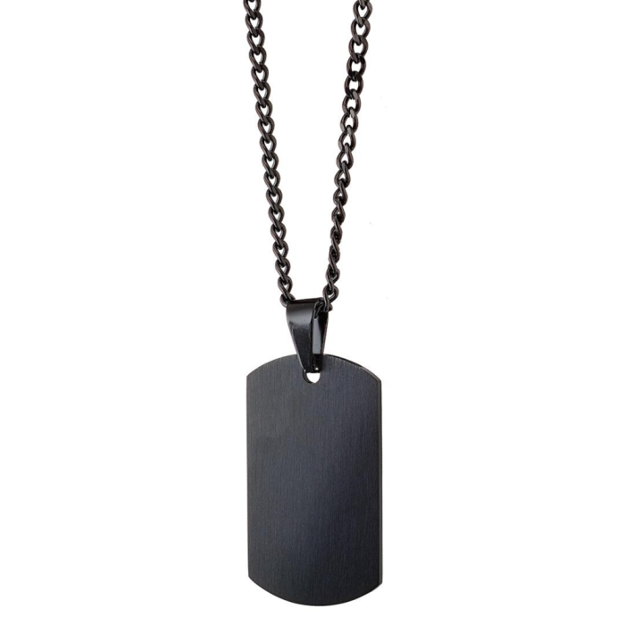 Pendant in the shape of military plate stainless steel colour black. This black military plate, sure value be it, will sublimate your neck daily and surpass the trials of time. One cuban channel matching is well included. This beautiful 2mm chain for pendant is absolutely unbeatable and displays a beautiful black color of the most virile.