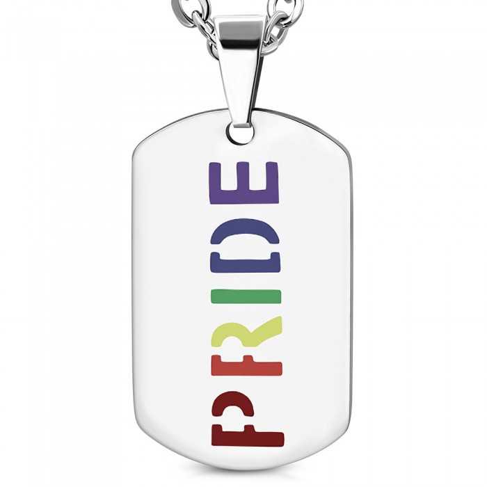 Steel pendant engraved with the word "PRIDE" of rainbow color for homosexual persons, bisexual, queer, transgender in order to claim freedom, equality and show pride.