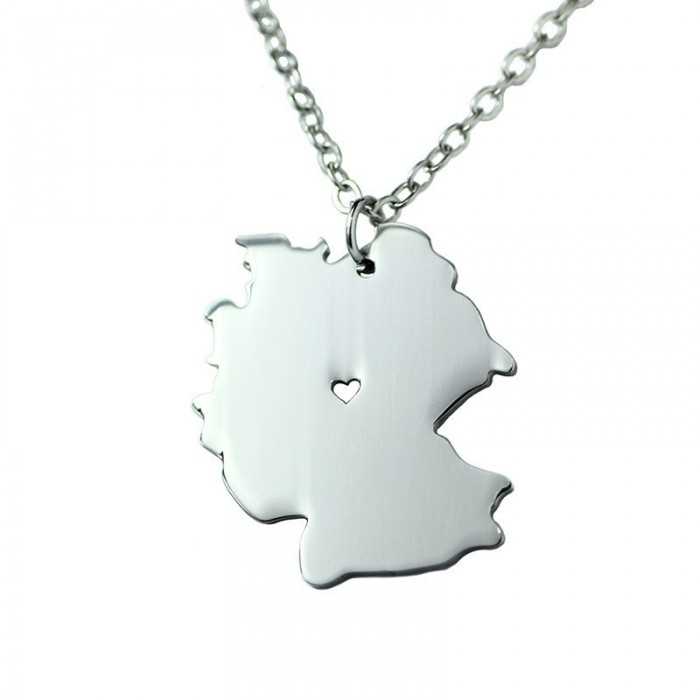 Map-shaped pendant in the country of Germany in stainless steel with a small heart inside. Chaine presents on photo offered. Possibility of customization on the recto and back side of the pendant, on our site.