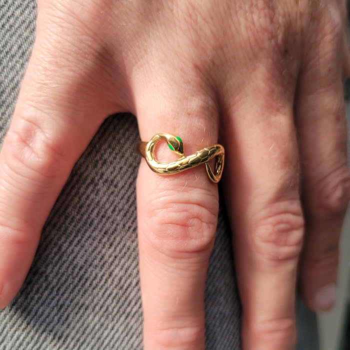 Discover this wonderful open ring snake designed gold stainless steel fine gold taking form of a infinite symbol. Wrapped your finger with this snake ring with sculpted bells with realistic snake skin and green eyes. Beautiful and attractive, this infinite snake ring will gently slip on your finger effortlessly. In search of human heat this snake will come to snatch against the finger that will adopt it.