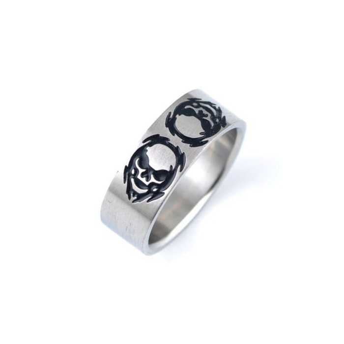 Steel ring with flammated death head engraved black all around the ring. The inside of the ring is completely smooth, so marry the finger perfectly with sensation.