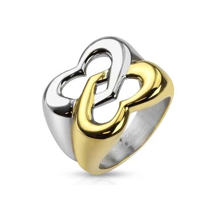 This fairly large ring, consists of 2 interlaced hearts welded, one in mirror polished stainless steel and the other in 18-carat gold plated offering sumptuous golden reflections. The duo of hearts thus brings a very artistic stylized version and a very contemporary stamp.