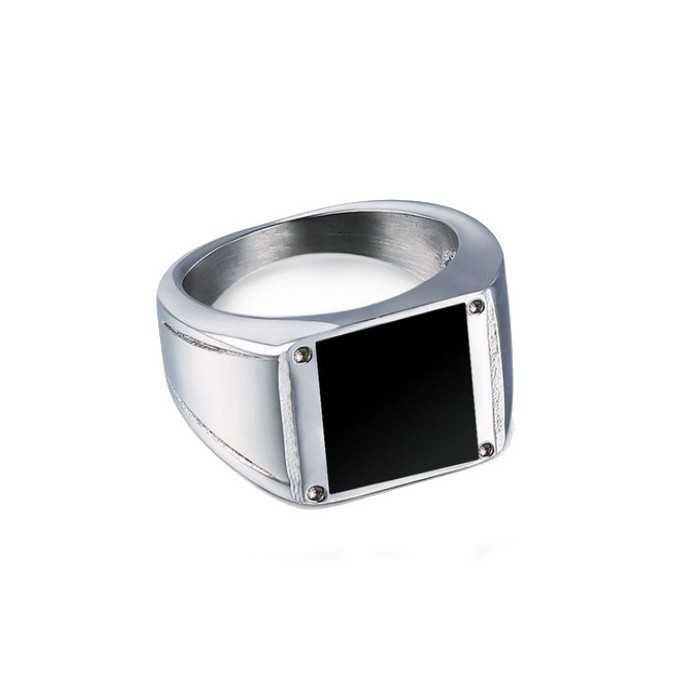 Men's signet ring stainless steel silver black onyx cabochon