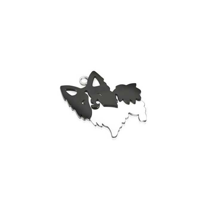 This cute little dog retained by a ring bend fixed on his pointed ear turned into a bicolored pendant that makes wonderful with all fashion styles. The head and back of the little dog masked by a black spot in relief contrast with the mirror-shaped polished steel reflections. We love the neat cuts of this fetish jewel with unusual cachet.