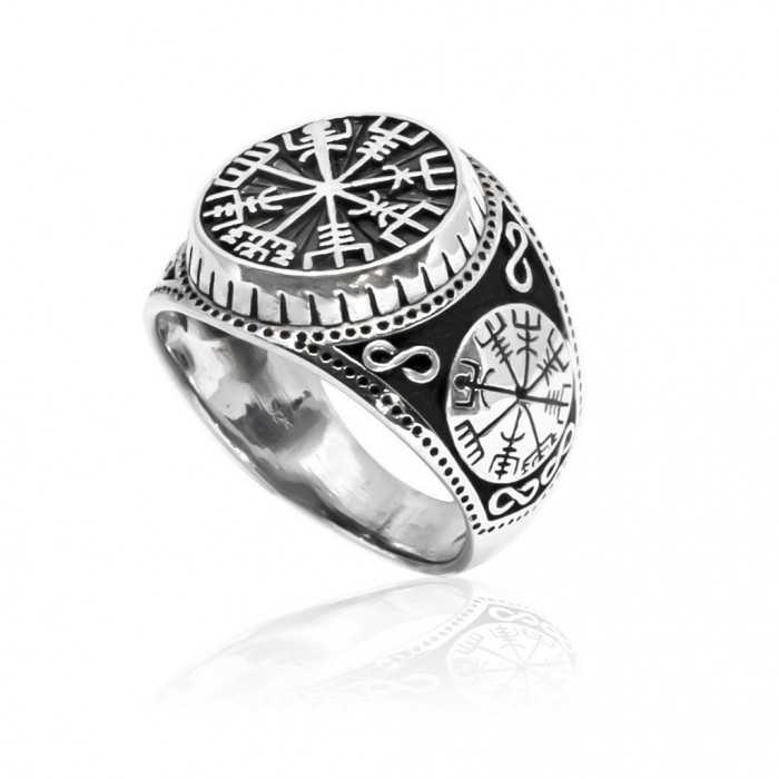 Gran caballero de acero inoxidable adornado con el símbolo de la brújula Vegvisir. Esta caballero le guiará a lo largo de su viaje. ¡Una brújula nórdica en la mano!