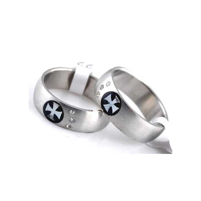 Anillo de acero pulido, adornado con pequeños zircones claros. Más que simbólico, este anillo con el dibujo de la cruz de malta con patas patas se convirtió rápidamente en el adorno de lujo.