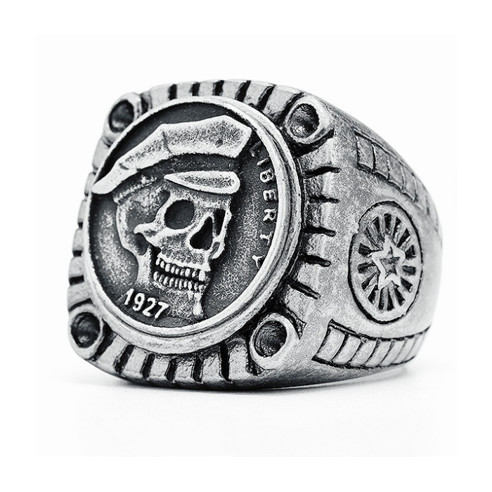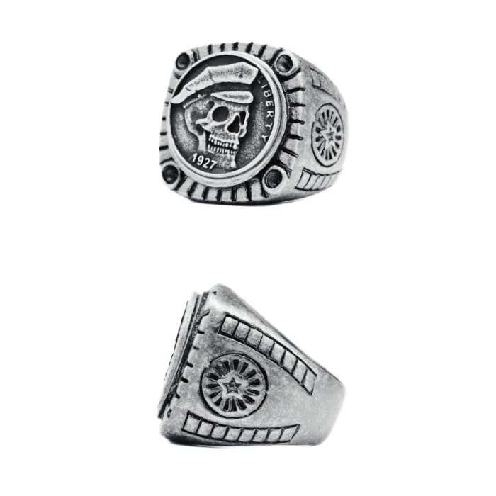Anillo de sello grande para hombre en acero con calavera de motorista liberty 1927