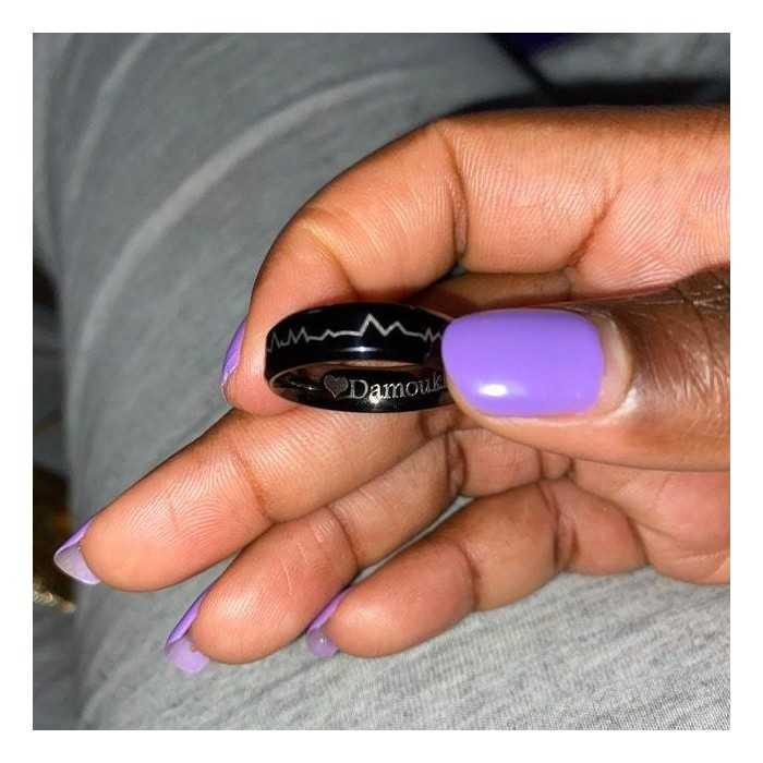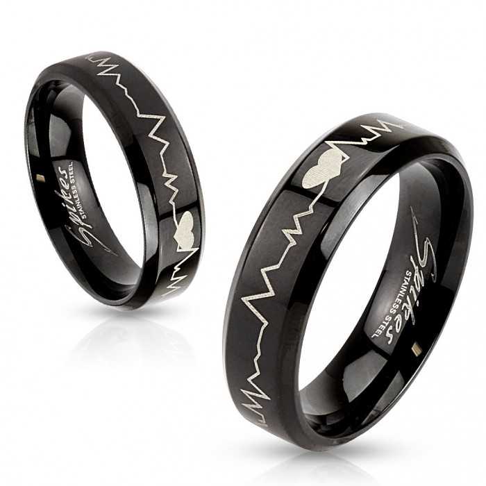 Anillo de acero inoxidable de 6 mm, lacado negro por ionización. Está grabado un patrón del latido del corazón, un verdadero símbolo de amor eterno. ¡Este anillo es ideal para regalar a su amante!!