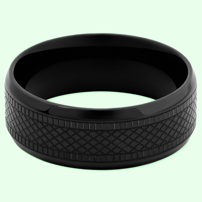 Aquí hay uno negro hombre anillo de acero acero inoxidable muy bien original y tendencia por sus motivos. Su superficie trillones y sus manchas finas se parecen a un neumático radial, brillante el color negro que a veces es un poco austero. Uno anillo para hombre, divinamente seductor, que combina muy elegante elegancia con notable calidad. El interior del anillo es completamente suave, así que cásate con el dedo perfectamente con la sensación. Mide 8 mm de ancho.