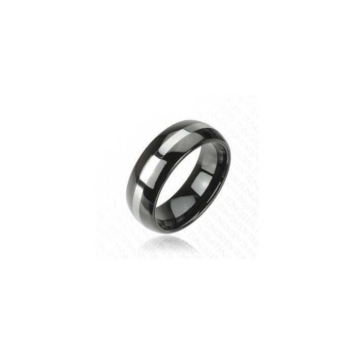 Un magnífico anillo de hombre ancho con acabados perfectos, hecho de tungsteno ultra resistente de color negro, que dura mucho tiempo, lo hace ideal para un anillo de compromiso. Este anillo tiene una franja plateada que combina originalidad, elegancia y brillo.