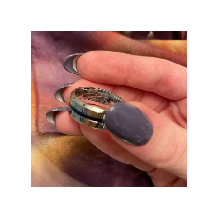 Este es un magnífico anillo moderno de acero inoxidable, decorado con una ranura central azul que corre por toda su circunferencia para una elegante mezcla.