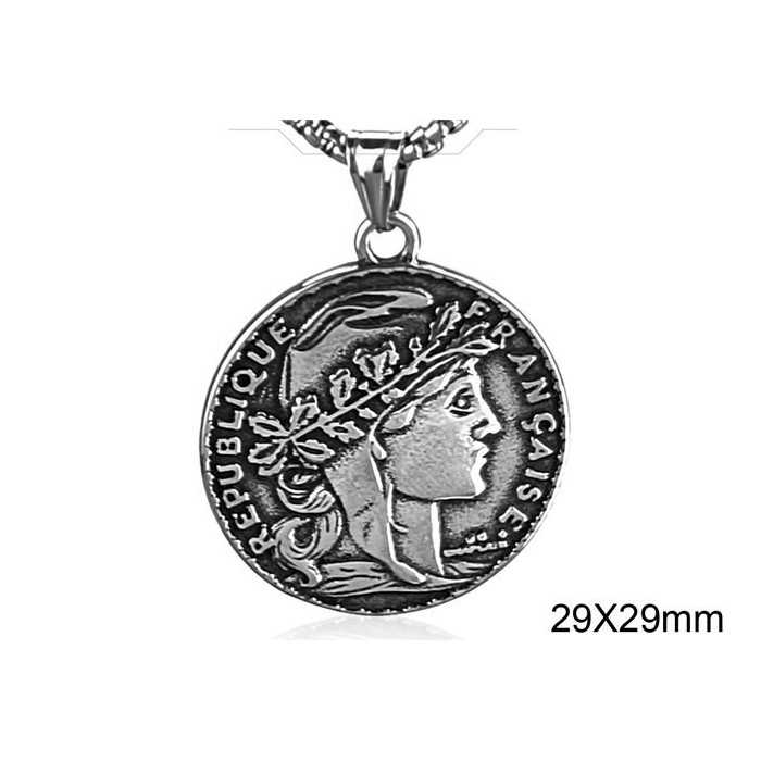 Le presentamos este magnífico colgante de acero inoxidable envejecido que representa una sublime reproducción de una famosa y antigua moneda de 20 francos de 1913, acompañada de una cadena estilizada incluida.