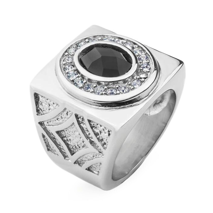 Un magnífico caballero esculpido para hombre de acero adornado en el plato con una lujosa piedra ovalada con facetas de ónice de un color negro profundo, bordeado con piedras blancas de zircón. Un caballero espléndido con un sello muy original que hace sensación con los trajes masculinos elegantes. El interior del anillo es completamente liso, por lo que se casa perfectamente con el dedo con sensación.