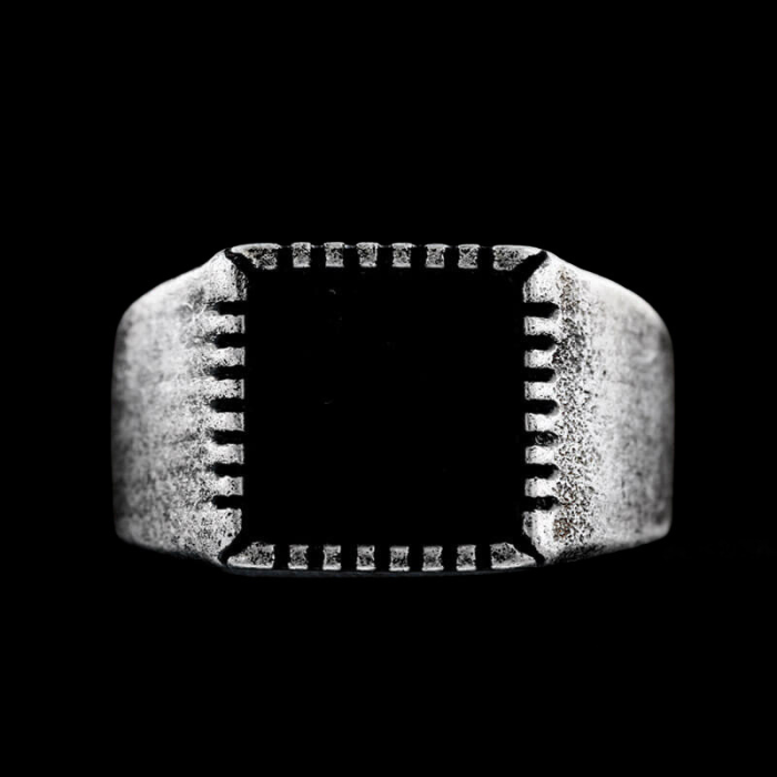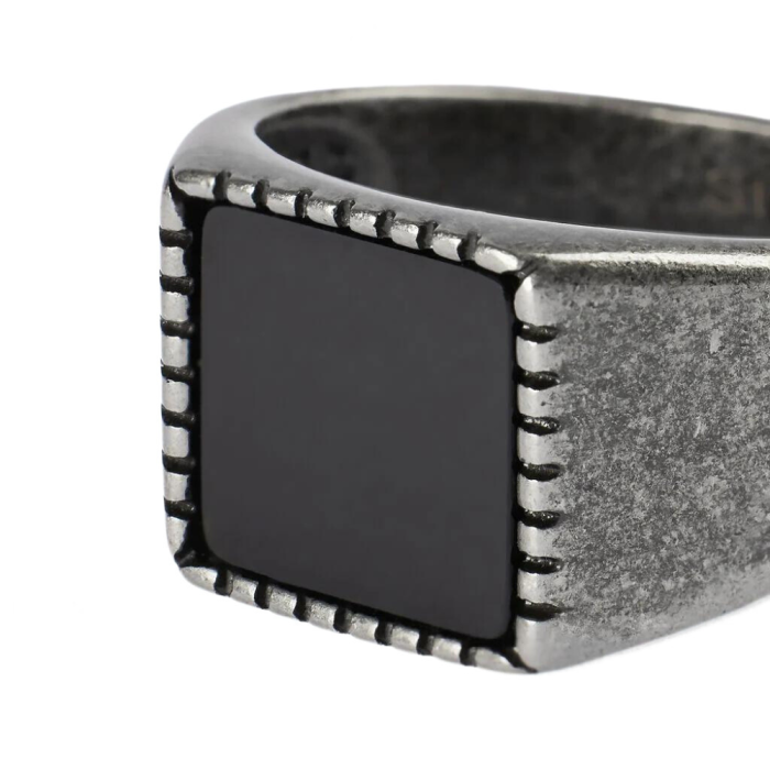 Descubre esta elegante anillo de hombre hecho de acero acero inoxidable envejecido en forma cuadrado con un ágata negra en su cara delantera. Esta obra maestra artesanal se casa con la mirada atemporal diseño vintage con un toque contemporáneo, perfecto para el'hombre moderno !