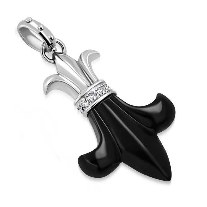 Un hermoso colgante original de acrílico y acero inoxidable en forma de rosa. En su parte más estrecha, la flor de lirio está rodeada por una pequeña corona de piedras de zircón, como para recordar el origen real de este símbolo. Una joya es realmente única.