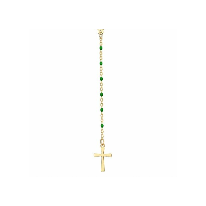 Este Rosario católico de acero inoxidable dorado con oro fino está equipado con una cadena fina decorada con cuentas de esmalte verde con una anchura de 1mm y una cruz y una medalla que representa a la dama de Guadalupe. Bajo este medallón, una cadena descendiendo de 5cm termina con una pequeña cruz cristiana para llevarla a toda discreción. La longitud total del collar es de 50 cm. Un rosario ideal para llevar a un bautismo de una joven o adolescente.