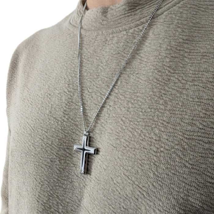 Diseñado en acero inoxidable esto colgante de plata y cruz negra a la connotación religiosa consiste en una cruz iluminado por un estrella negra añadir un sorprendente efecto de alivio. La línea es muy suave, elegante y moderna. Uno colgante de cruz macho que es realmente único con acabados precisos y limpios que combina la moda y la religión. Las medidas del colgante 37 x 27 mm.
