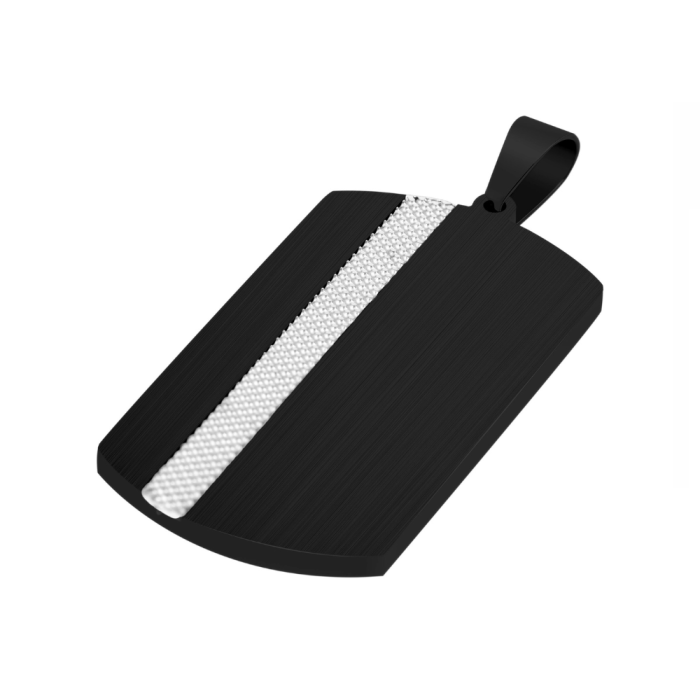 Sober y chic este colgante recuerda a una placa militar o ''dogtag'es un verdadero enamoramiento. Aquí hay un collar colgante moderno para hombres, hecho de acero inoxidable negro inspirado en un placa militar con bordes redondeados. El plato está meticulosamente decorado con un raya de plata esculpida cunas. Se presenta y vende con su elegante cadena.
