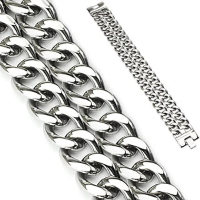 Esta es una gourmet original grande de 23 mm de ancho de acero inoxidable con un cierre de seguridad plano. La originalidad de este plato es que se divide en dos cadenas de malla cubana.