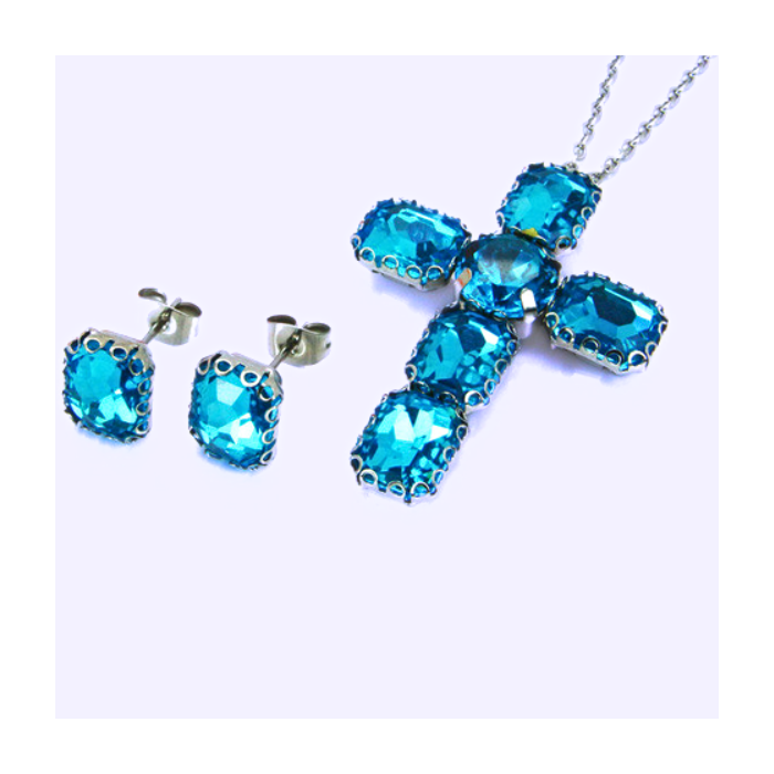 Este es un hermoso adorno hecho de acero inoxidable que contrasta maravillosamente con el brillo de los cristales azules turquesa con efecto diamante. Este adorno se compone de una fina cadena de malla forzada que se usa en el cuello, un colgante en forma de cruz y pendientes.